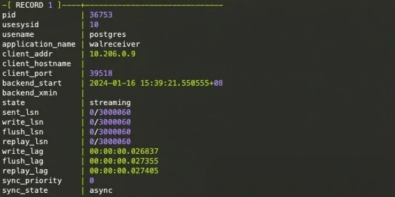psql -x -d postgres -c "select * from pg_stat_replication"