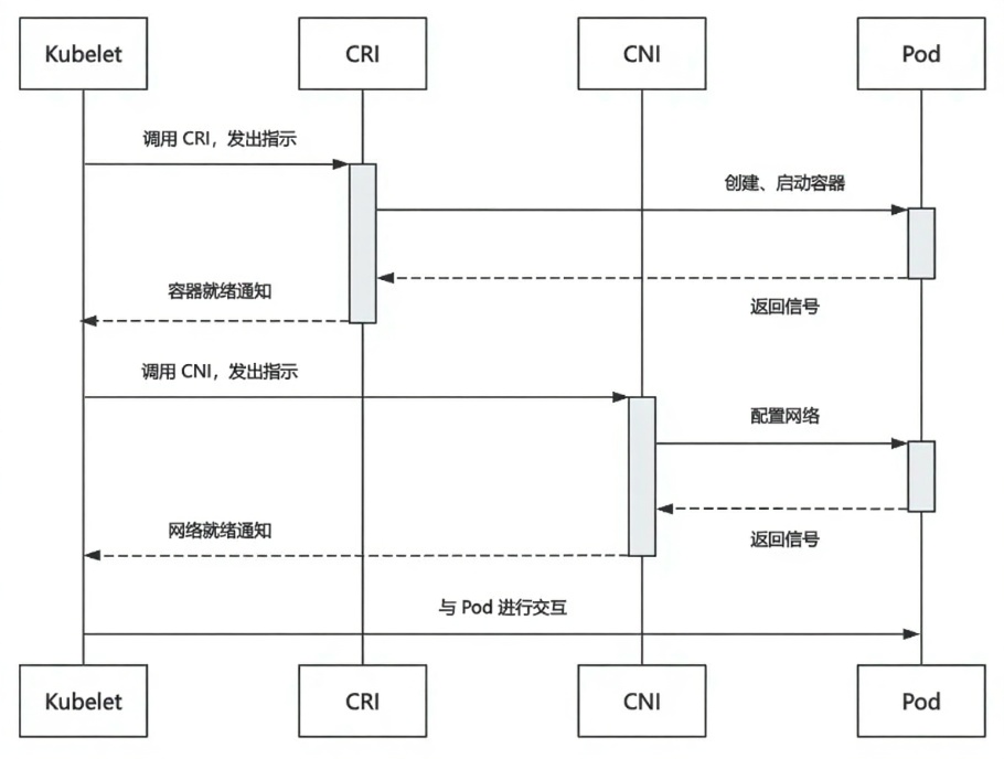 CNI 到 Kubelet:CNI 通知 Kubelet 组件,Pod 的网络已准备就绪