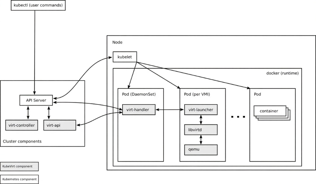 KubeVirt 的架构设计利用了 Kubernetes 的可扩展性,将虚拟机管理功能作为附加组件集成进来。其核心组件及示意图如下:
