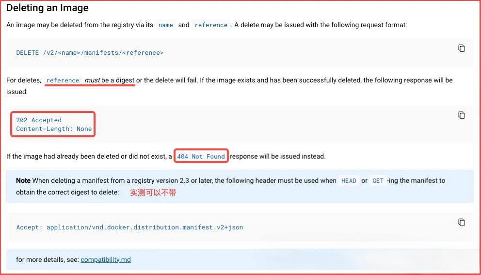 # 第一步:参考常用 API 请求,自行获取镜像的 repository 和 digest 信息 # 第二步:删除镜像curl -I -XDELETE 127.0.0.1:5000/v2/<repository>/manifests/<digest> # 第三步:垃圾回收docker exec local_registry bin/registry garbage-collect /etc/docker/registry/config.yml