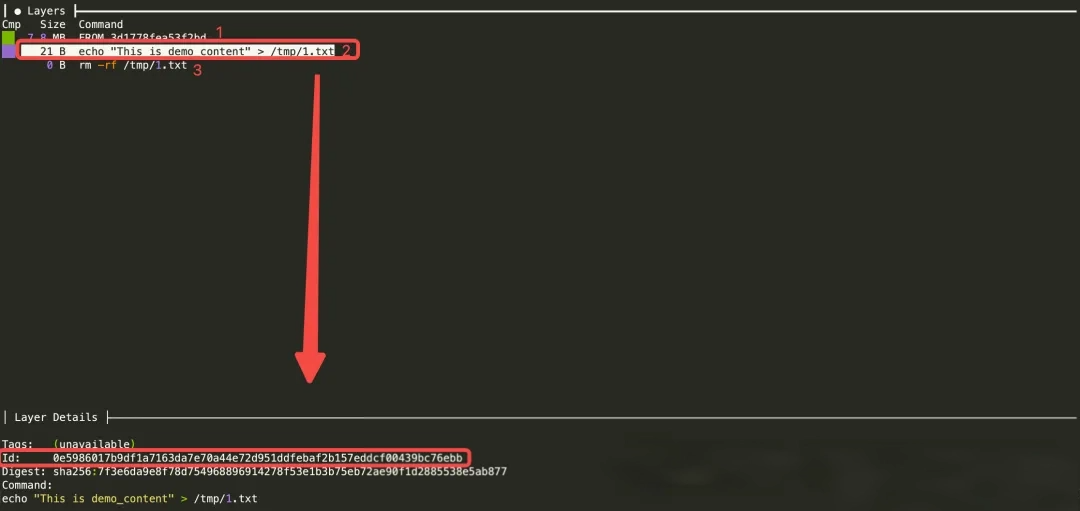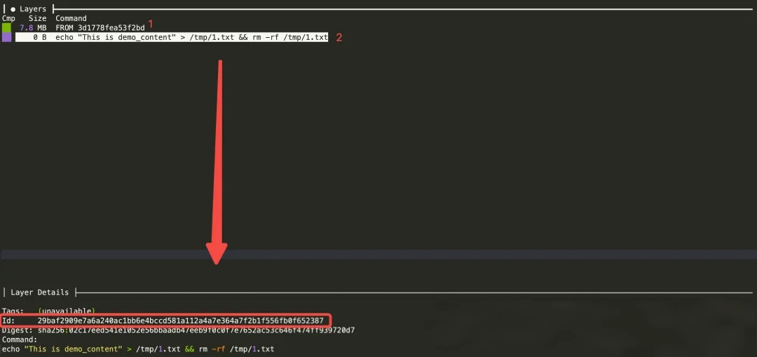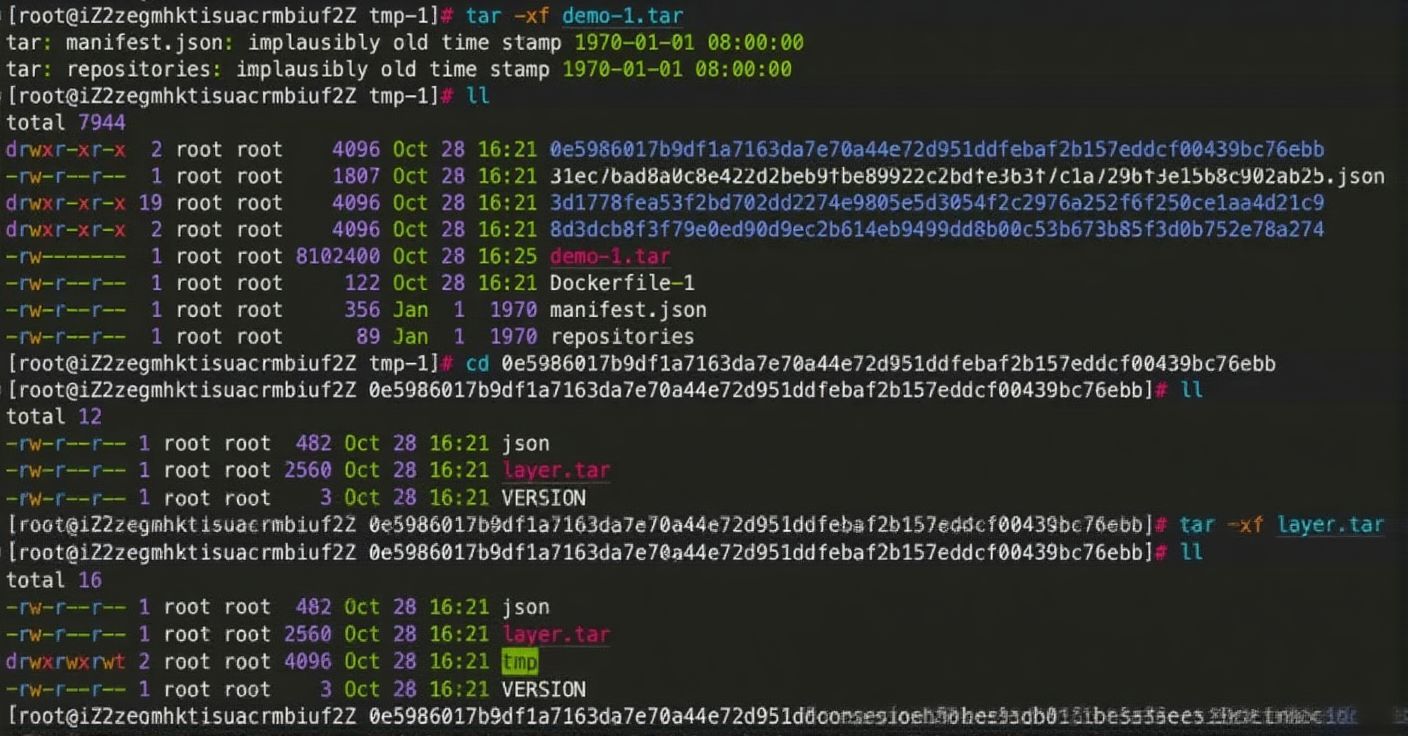 # 将 Docker 镜像保存为 tar 文件docker save alpine:demo-1 -o demo-1.tar # 查看 tar 文件内容tar -xf demo-1.tarcd 0e5986017b9df1a7163da7e70a44e72d951ddfebaf2b157eddcf00439bc76ebbtar -xf layer.tarcat tmp/1.txt