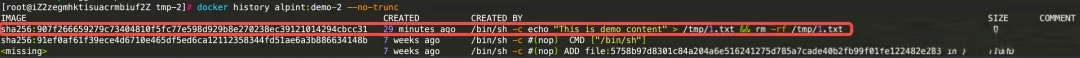 # 指定基础镜像FROM alpine # 指定 RUN 指令(一条命令,实现创建文件、删除文件)RUN echo "This is demo_content" > /tmp/1.txt && rm -rf /tmp/1.txt