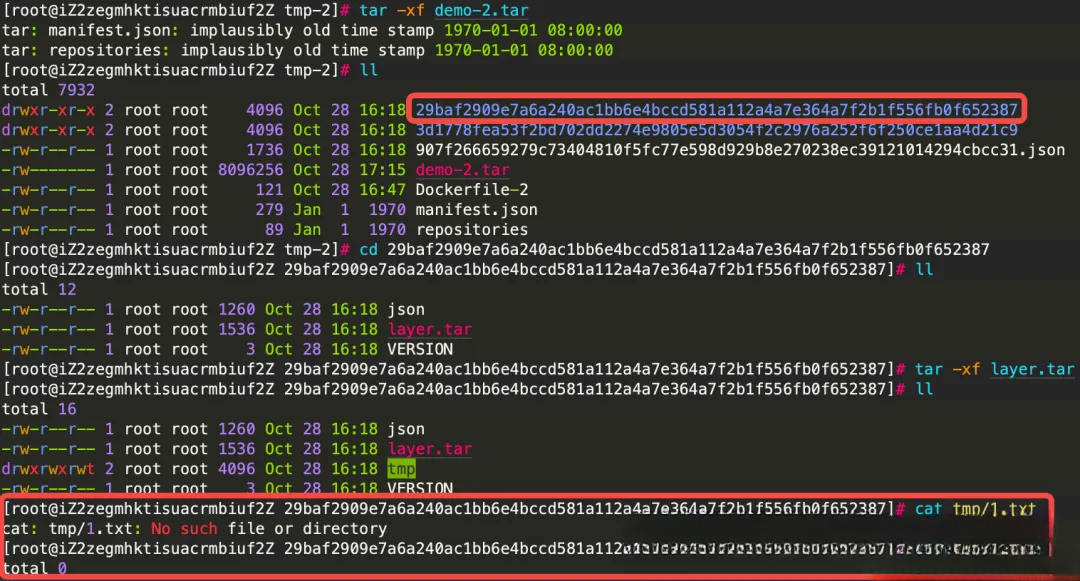 # 将 Docker 镜像保存为 tar 文件docker save alpine:demo-2 -o demo-2.tar # 查看 tar 文件内容tar -xf demo-2.tarcd 29baf2909e7a6a240ac1bb6e4bccd581a112a4a7e364a7f2b1f556fb0f652387tar -xf layer.tarcat tmp/1.txt